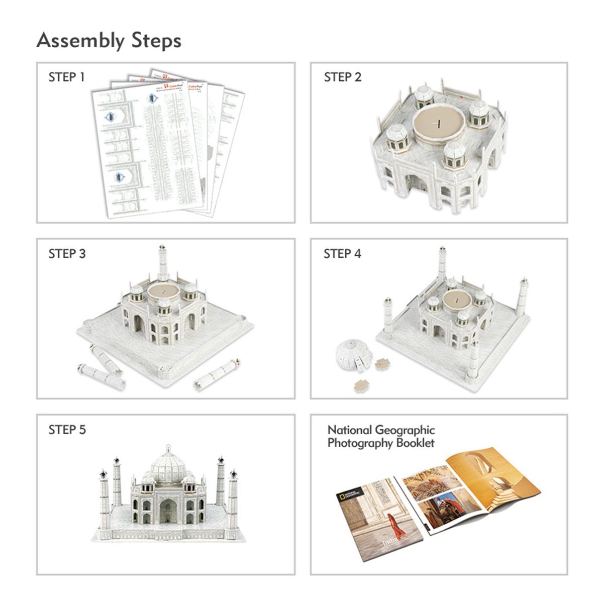 Recreates Magnificent Taj Mahal Landmarks Cubicfun 3D jigsaws take you a wonderful journey when you build the world-historical architecture -Taj Mahal. Bring it home and build up your own masterpiece! The 3D model puzzle with a photography booklet, which delivers city culture and lifestyle of India through the exquisite illustrations coupled with evocative text. You can build and discover the Taj Mahal through the vivid National Geographic booklet. Fascinating architectural model India photography booklet. Easy to assemble. Designed for display.