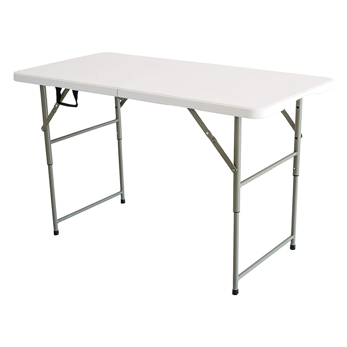 This table folds in half and lies flat when folded for easy storage in the closet, under your bed, anywhere it fits. The handy handle makes it easy to transport. Simple yet classic, our white tabletops complement any decor at your venue of choice, whether in a home, backyard, or garden, for casual and formal occasions alike. Large in size, this table accommodates many people for any occasion, ranging from outdoor parties in the summer to weddings and dressy events. Celebrate! Our impact-resistant resin surfaces are supported by powder-coated steel frames with arched rails. Waterproof, stain, and scratch-resistant, they are built to last a lifetime. Four heavy-duty steel legs easily fold in and out for hassle-free setup. The resin finish wipes clean with a washcloth. The lightweight frame and handle facilitate transportation.