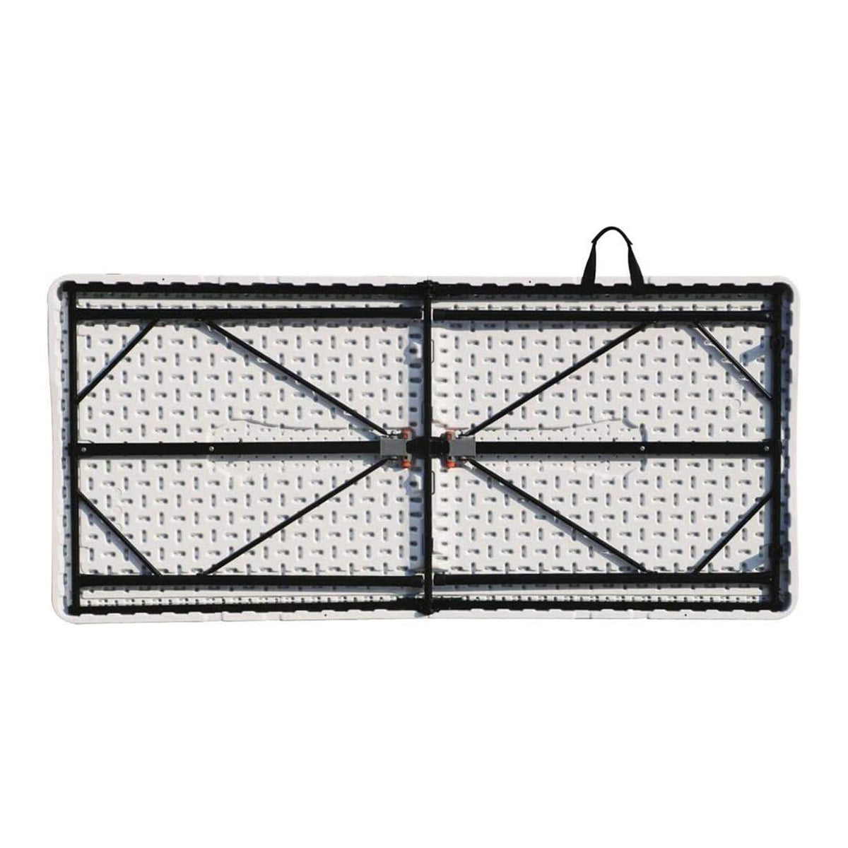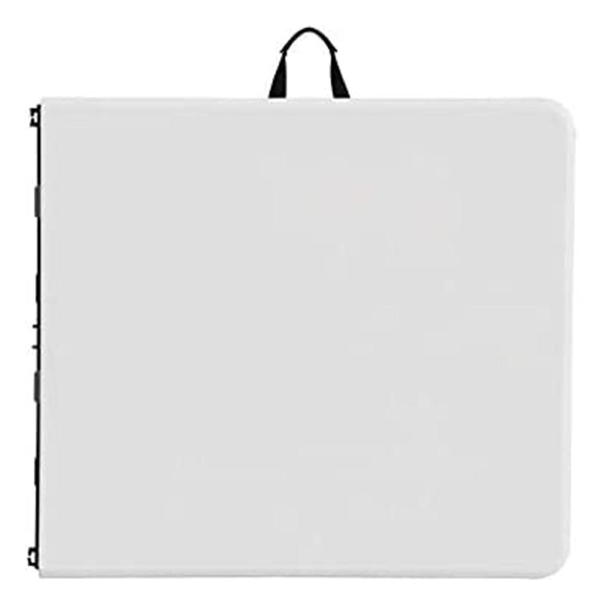 This table folds in half and lies flat when folded for easy storage in the closet, under your bed, anywhere it fits. The handy handle makes it easy to transport. Simple yet classic, our white tabletops complement any decor at your venue of choice, whether in a home, backyard, or garden, for casual and formal occasions alike. Large in size, this table accommodates many people for any occasion, ranging from outdoor parties in the summer to weddings and dressy events. Celebrate! Our impact-resistant resin surfaces are supported by powder-coated steel frames with arched rails. Waterproof, stain, and scratch-resistant, they are built to last a lifetime. Four heavy-duty steel legs easily fold in and out for hassle-free setup. The resin finish wipes clean with a washcloth. The lightweight frame and handle facilitate transportation.