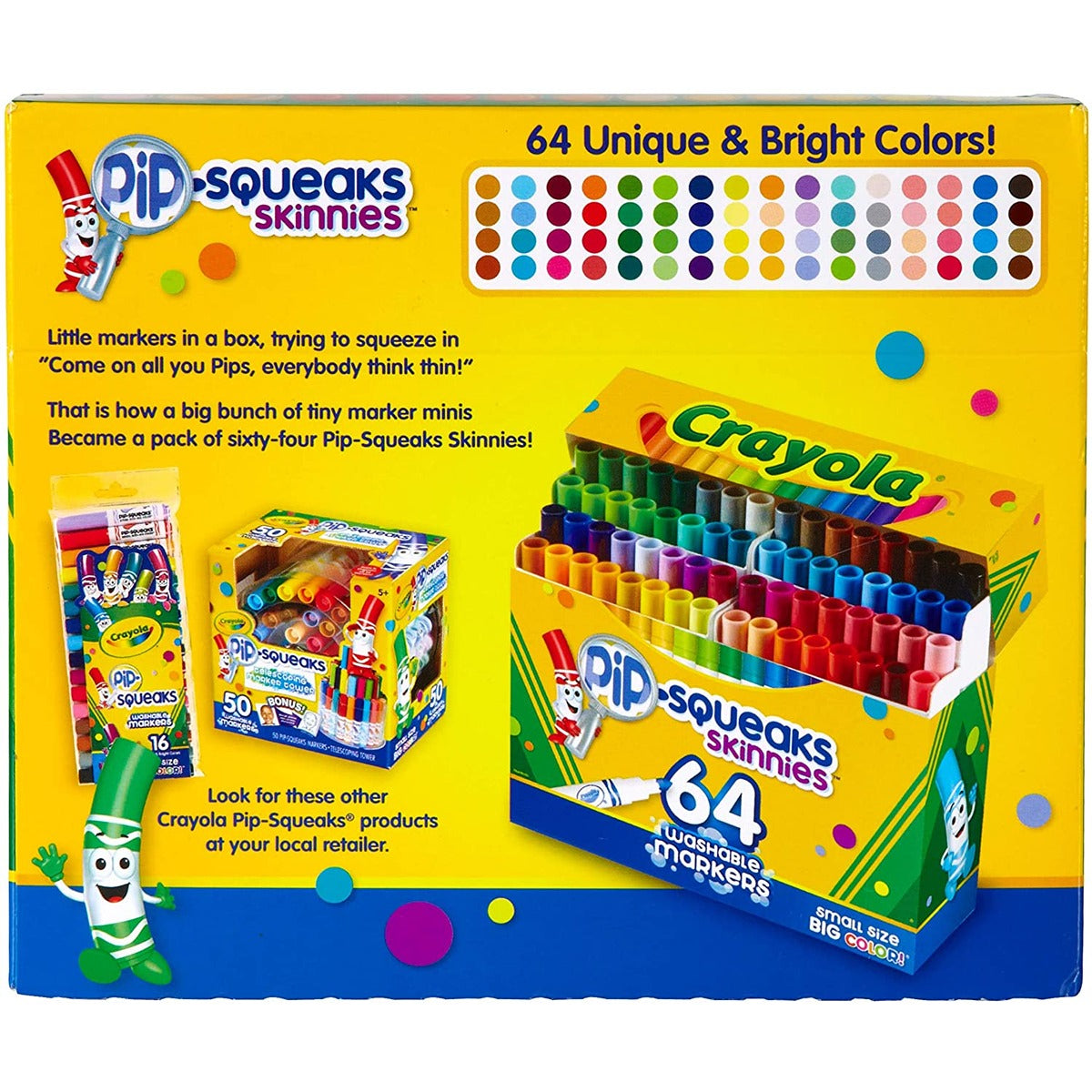 Small but mighty, Crayola Pip-Squeaks Skinnies Markers come in extra short barrels that pack a big punch! Featuring 64 assorted colors, this marker set includes 8 Crayola Kids? Choice Colors that are chosen and named by kids! Crayola washable markers let kids create and color without the mess. Specially formulated to wash from skin, walls, and most clothing, these Pip Squeaks Markers are perfect for art activities at home and on-the-go! Packaged in a reusable flip-top box and tiered sleeves for easy access and organization. Pair with a Crayola coloring book for a great bundled gift for kids. Safe and nontoxic, ideal for ages 3 and up.
