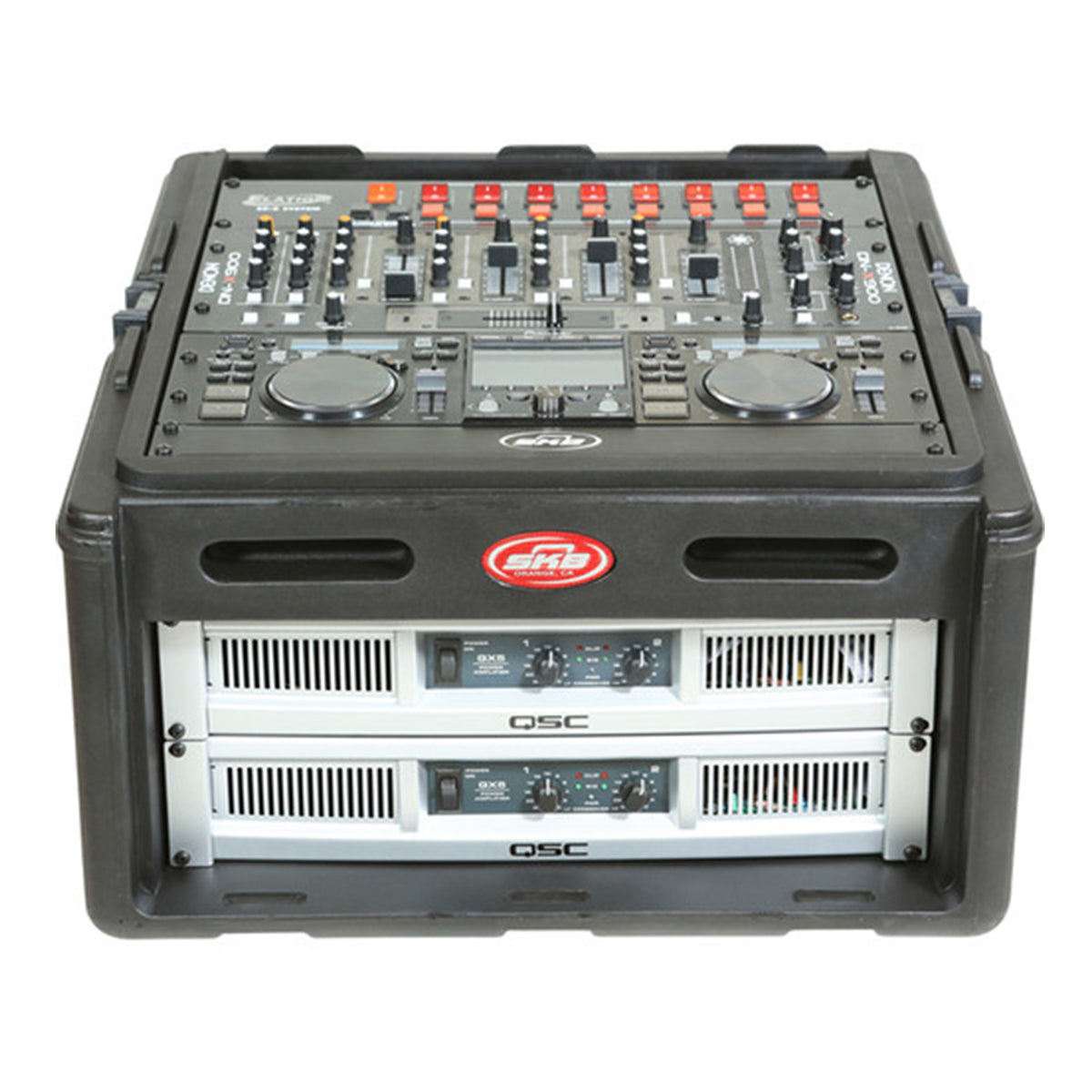 Top and front rugged steel threaded rails provide secure mounting of your equipment. The rear door also provides rapid access to the gear. In addition, the hard lid and doors add security to an already durable case. It"s been designed to even hold the SKB AV-8 Audio-Visual Shelf with the top closed. The case is complete with two TSA (Transportation Security Administration) trigger latches. A recessed handle makes for strong portability. Backed by its limited lifetime warranty, the Audio and DJ Rack Case offers security and durability for the pro and amateur alike.