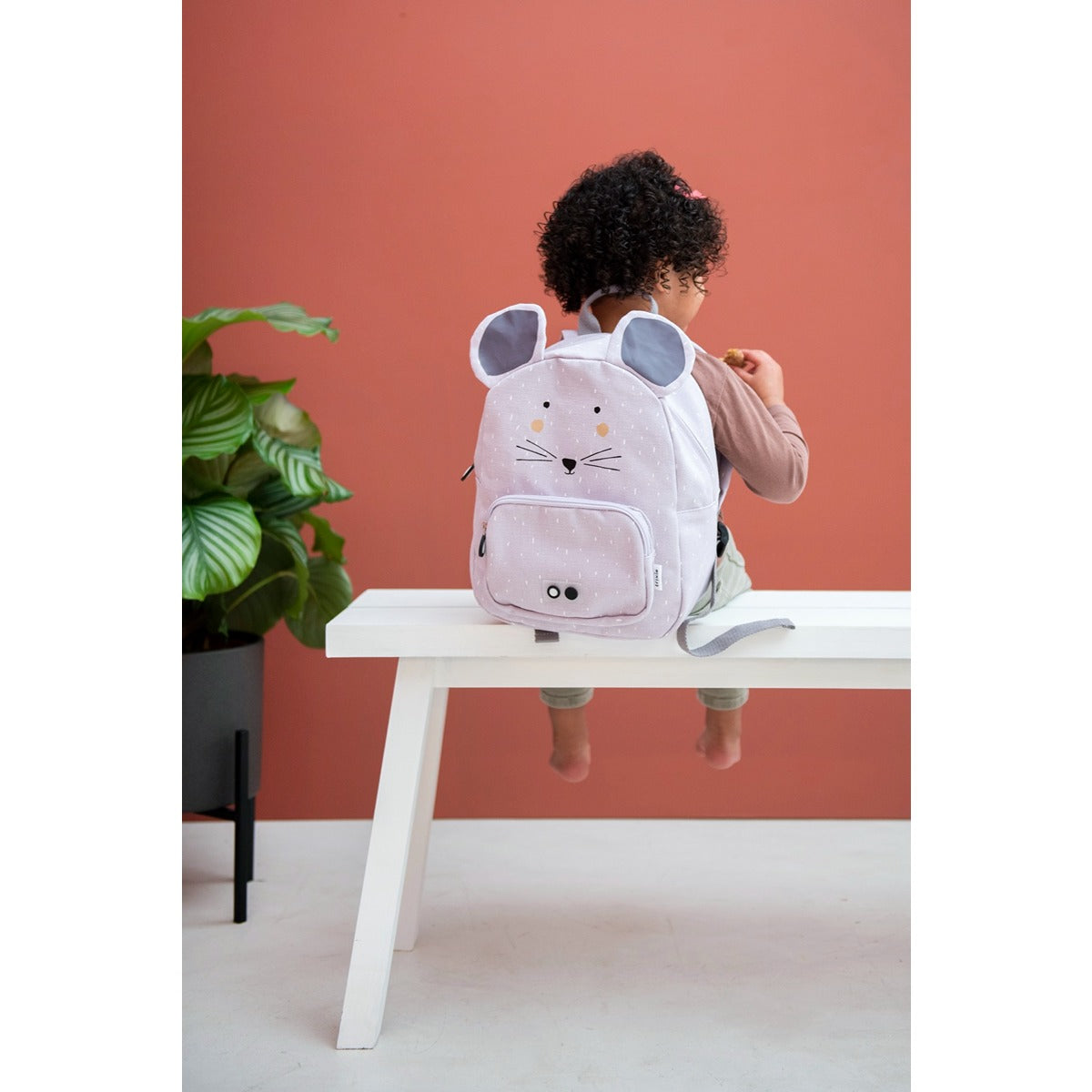 With this cute backpack your child is completely ready for any adventure or first trip to school! The backpack has adjustable and padded shoulder straps and a short handle at the top to easily hold and hang it everywhere you go. The chest strap prevents the shoulder straps from falling down. The backpack has a big compartment and a little front pocket, where you can nicely store a little snack or so. The main and front pocket have a zipper that allows children to easily open and close the backpack themselves. In order not to loose your traveling companion, a name tag is provided on the inside of the bag. Furthermore, the backpack is water repellent.