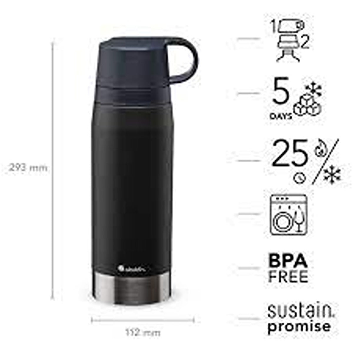 - PLAY LONGER: This large capacity 1.1L Thermavac Vacuum Bottle with built in Twin Cup for sharing keeps your favourite beverages (coffee, tea, water) hot or cold for 25 hours, 5 days when iced. Available in 3 trend-forward colours and a durable powder coated finish.