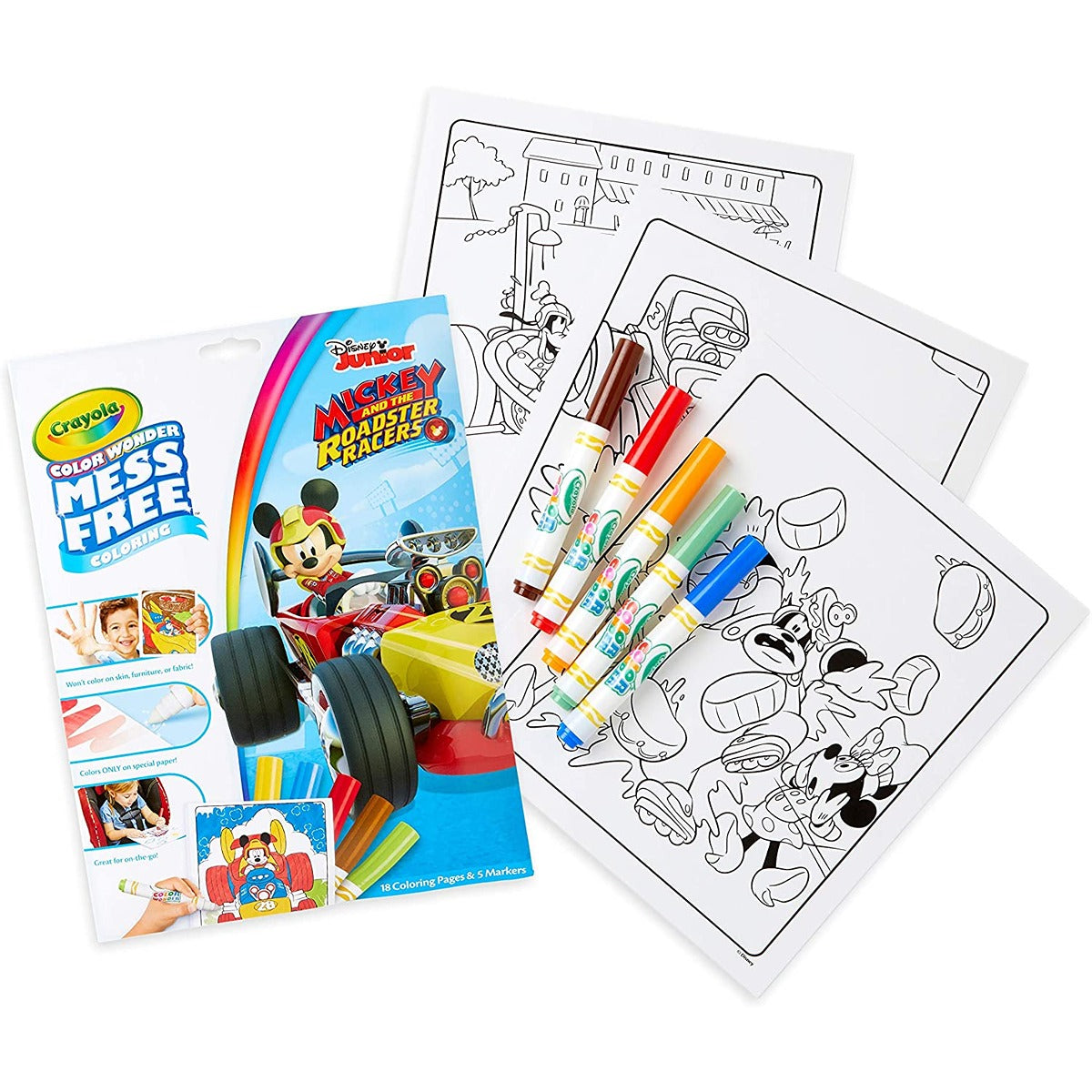 - COLOR WONDER SET: Features 18 Mickey and the roadster Racers coloring pages and 5 color Wonder markers.