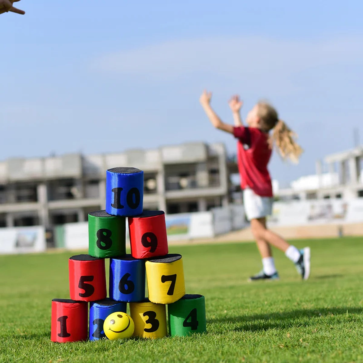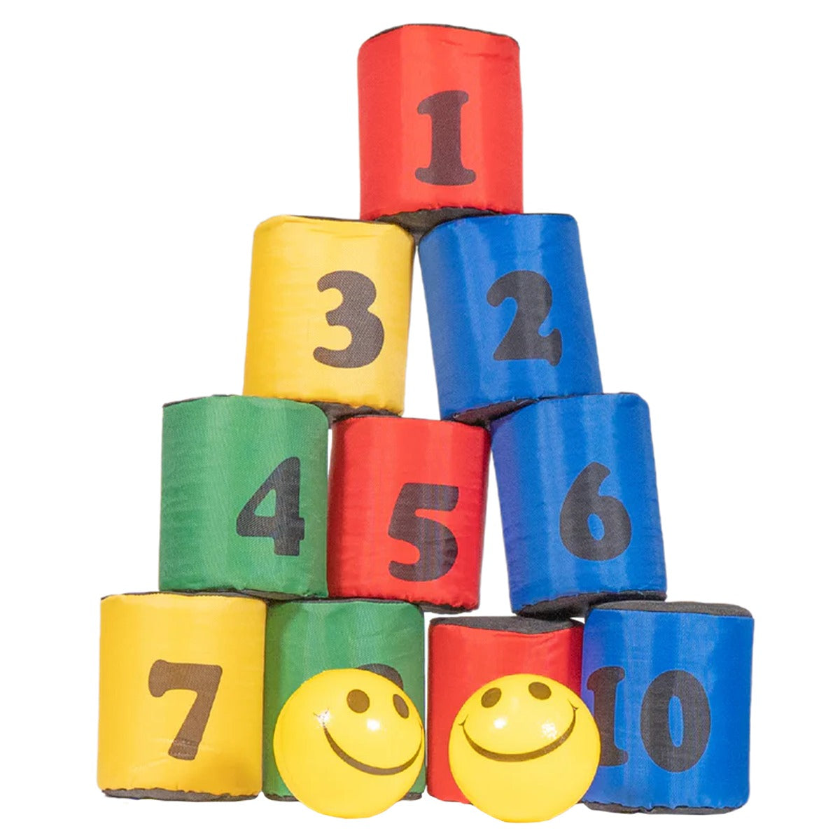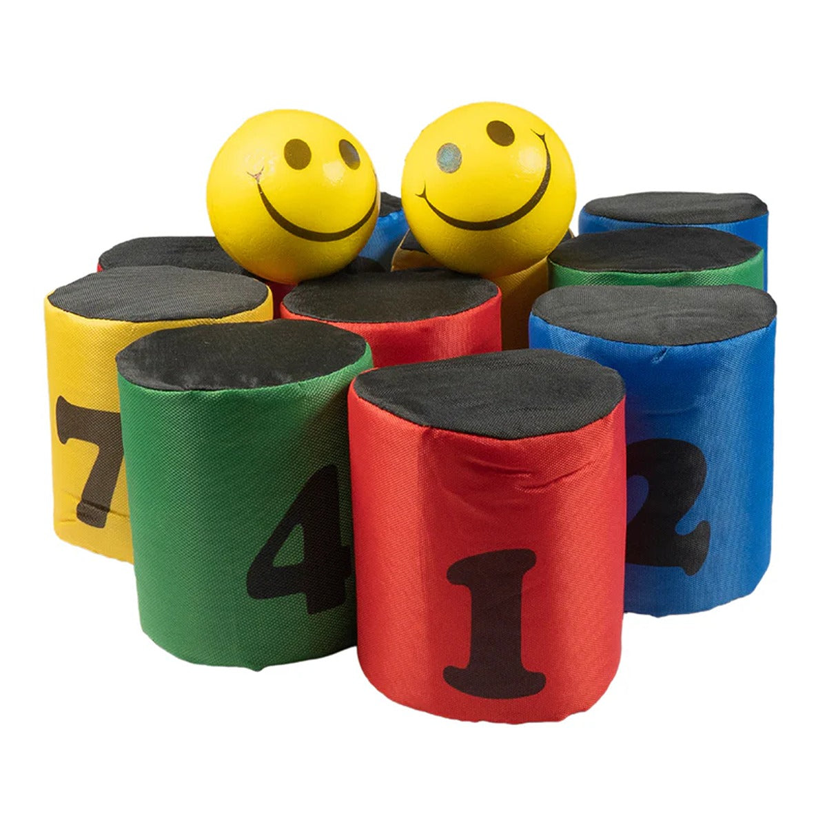 Foam covered numbered cans for fun throw at game. Set of 10 cans with 2 soft balls.