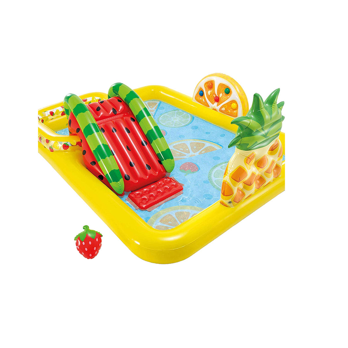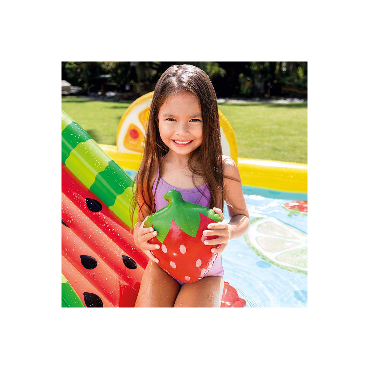 Included you will also find 6 balls that you can throw and fit into the shape of the orange, and an inflatable strawberry. Finally, it is important to note that if you connect the water hose to the pool, you will get some fun splashes of water around the small pool and drain plug at the bottom of the pool