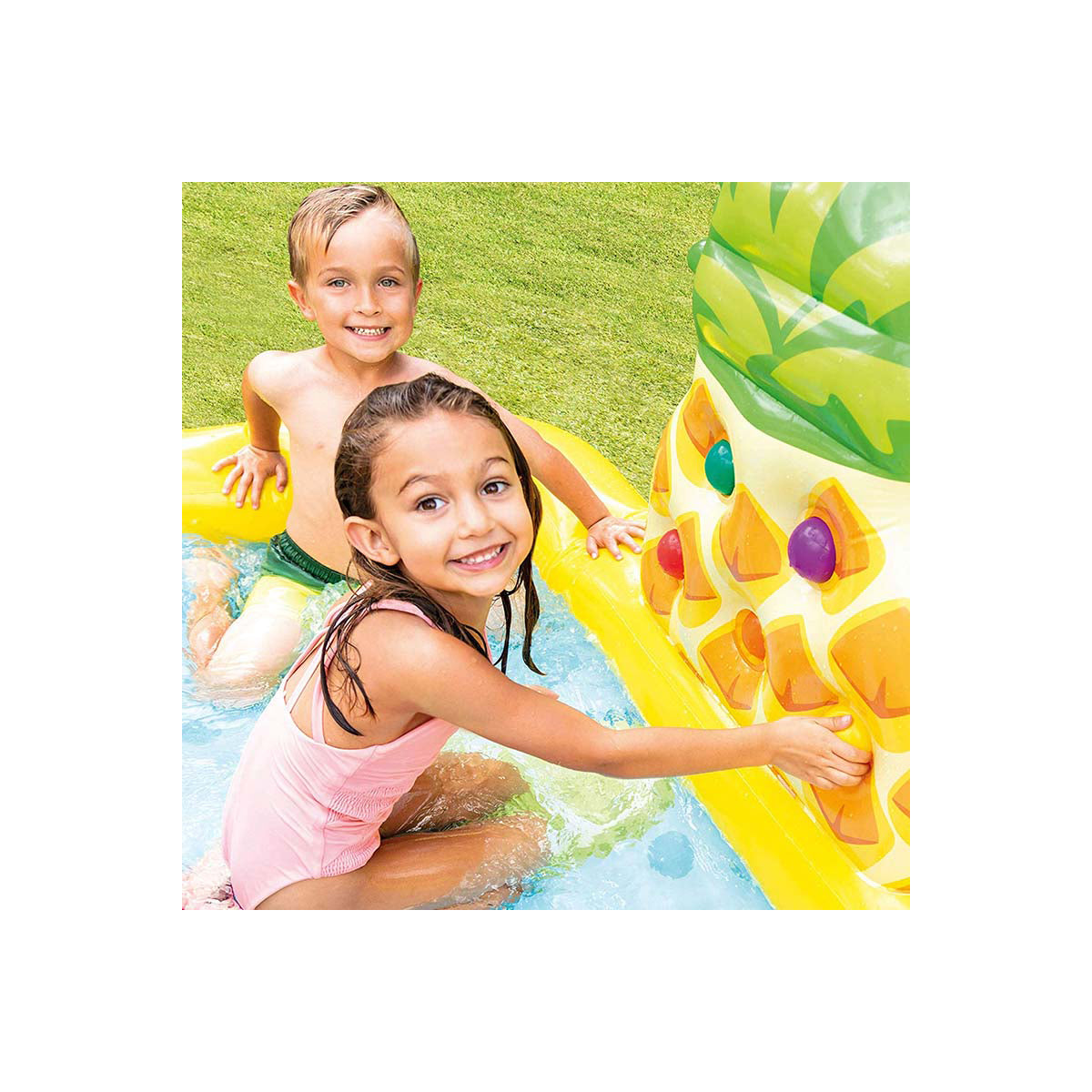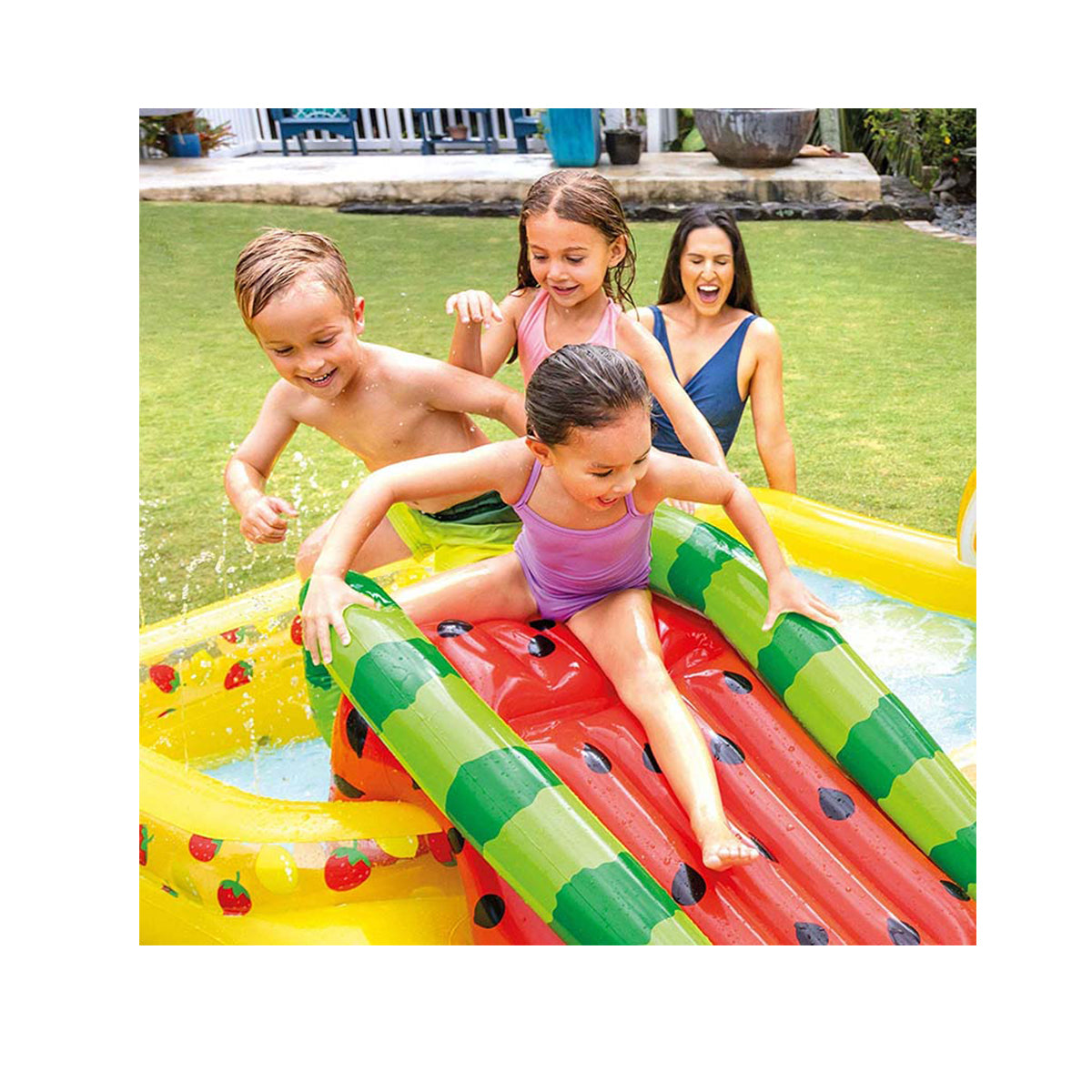 At the end of the slide there is a very comfortable inflatable cushion that softens the descent and the live-motiv of the inflatable pool are the fruits, in fact pineapple, strawberries and orange are represented.