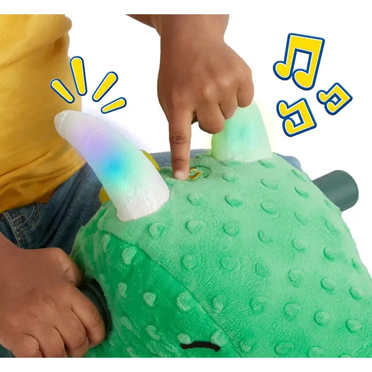 Enjoy endless imaginative play and interactive lights & sounds with this plush dragon. Fun Interactive Lights & Sounds Jade the Dragon comes to life with its built-in interactive lights and sounds! Pressing the button on Jade?s head or petting the nose activates playful music and sounds that your child is sure to love. The dragon?s horns also light up as the dragon moves, filling the room with magic! Jade?s sound module also features an on/off switch and two volume settings for quieter adventures. 360? Caster Wheels EZ-Glide? 360? wheels allow a full range of movement while making for a comfortable ride! Safe for both indoor and outdoor use, Jade?s wheels ensure that the fun can continue from hardwood floors to the driveway or sidewalk. Plush Friendly Face Your child?s new best friend is built for hugs! With a soft and plush face, Jade is perfect for cuddling between rides. Jade also features textured fabric and crinkle wings for multi-sensory play as your little one explores with their favorite animal friend.