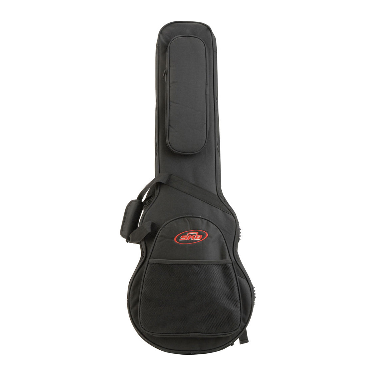 The Soft Guitar Case by SKB fits Gibson Les Paul guitars, and offers full neck and body protection. The case"s exterior is made of weather-resistant 600 Denier ballistic nylon with an EPS foam interior. Featuring a double pull zipper, a carrying handle, padded backpack straps, and exterior accessory pouches, the case is designed to keep your instrument safe during storage and travel. Refer to the specification tab for dimensions of compatible instruments.