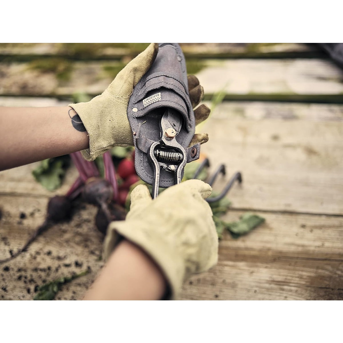Durable steel construction, classic copper accents, and a weather-resistant waxed canvas sheath make the Pruners a lasting staple of indoor and outdoor tools for all your gardening needs.