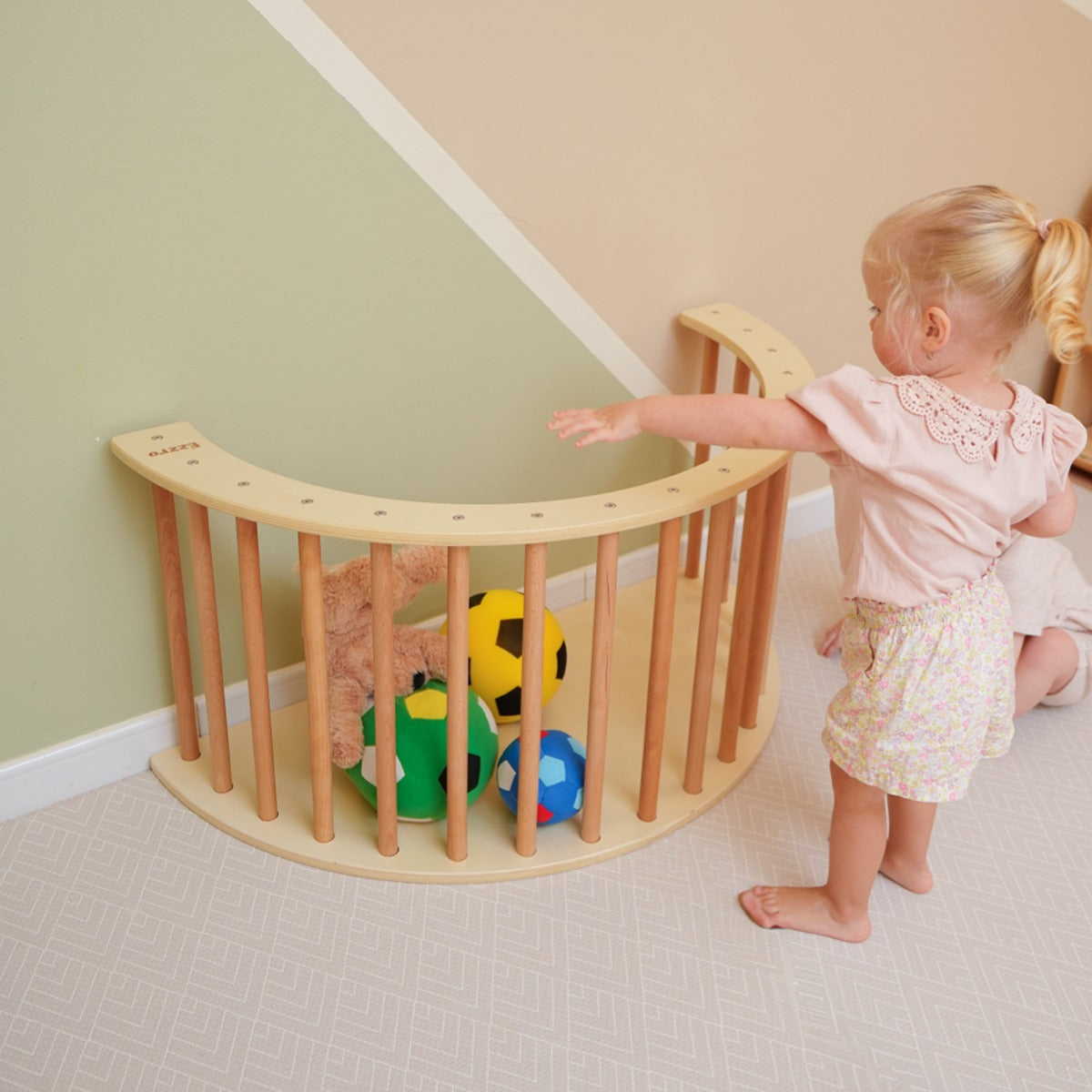 Versatile Design: The Wooden Climbing Arch with 3-in-1 functionality is a dynamic piece of play equipment suitable for children aged 1 to 6 years, designed to support active play and development. - Rocker Mode: When flipped, it becomes a sturdy rocker that kids can use to rock back and forth, developing balance and coordination. - Table Configuration: The arch can be set up as a table, providing a stable surface for children to draw, eat, or engage in other activities. - Toy Storage Solution: It serves as a convenient storage space for toys, keeping play areas tidy and organized. - Swing Feature: The arch transforms into a safe swing, offering another fun way for children to play and learn. - Resting Area: By placing a cushion on the arch, it becomes a cozy spot for children to lay down and relax or read a book. - Easy to Assemble: The design allows for easy assembly. - Space-Efficient: Its compact size makes it an ideal addition to any playroom, nursery, or living area without taking up too much space. -Eco-Friendly Material: Made with eco-friendly materials, this climbing arch is not only safe for your child but also kind to the environment.
