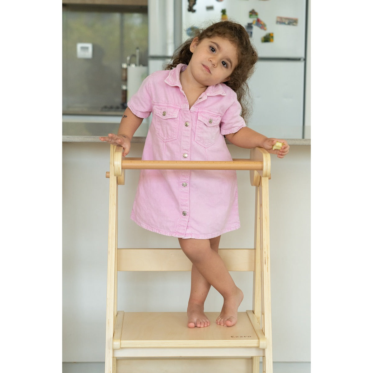 With its ever-expanding product line, Ezzro thought why let your little one miss out on any activities with you? Introducing the new Ezzro Folding Kitchen Tower in white colour. It?s designed to keep up with the highest standards of Montessori furniture, whilst making it the utmost fun. Helping mommy in the kitchen, brushing your teeth, washing your hands or reaching something yummy? This new kitchen tower is there for you every step of the way. It?s foldable, easy to store, grows with your child and super safe to use under adult supervision. Step up and happy playing!1 solid high grade birch plywood & beech wood bars Folding Kitchen Tower in White