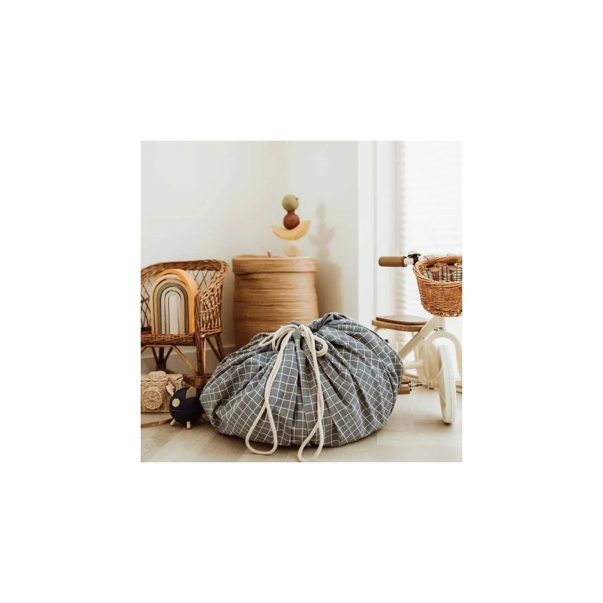 Your favourite storage playmat just got an upgrade! A timeless grid pattern that looks good anywhere.. and now entirely made from organic cotton! Toy storage isn?t always practical. Toys get lost at the bottom of a basket or every single toy gets dumped out and never return.. and are probably found under the bed, weeks later! Our storage playmats are changing the game, quite literally. Go from storage to play in seconds. Toys get spread out on your playmat but cleanup is still easy. Simply pull the strings and see your playmat transform into a storage bag again. Our new Grid Print will add a beautiful touch to any space. Which is great, because our Play&Go bag is made to be carried from room to room. Toy storage that looks good, anywhere.