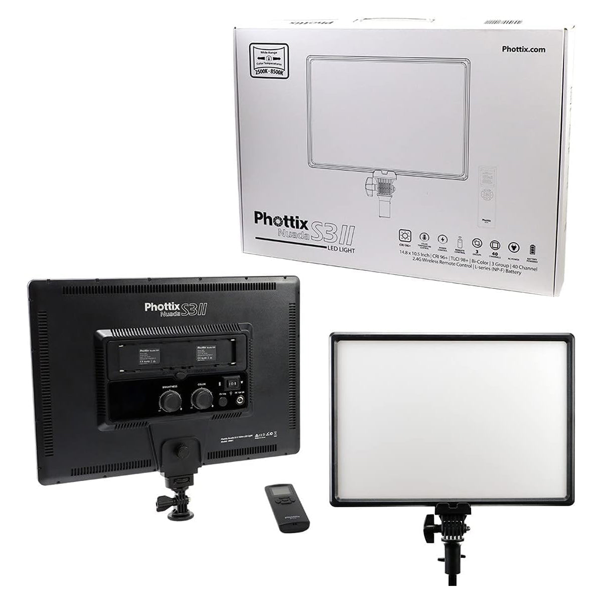 - Softlight design for 40W of flattering light Excellent color – CRI rating of 96+/TLCI 98+ Phottix LED Ecosystem (ECO3) via 2.4G remote control with 3 groups and 40 channels Wide range color temperature 2500K-8500K Digital brightness and temperature control panel AC adapter and NP batteries operation (not included battery) Compact size – 25mm thick