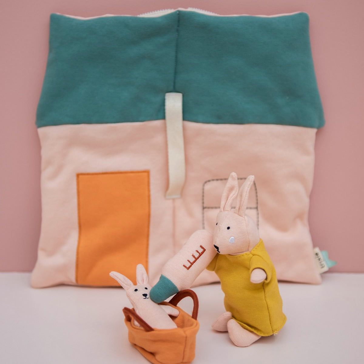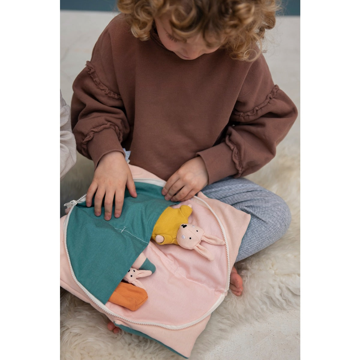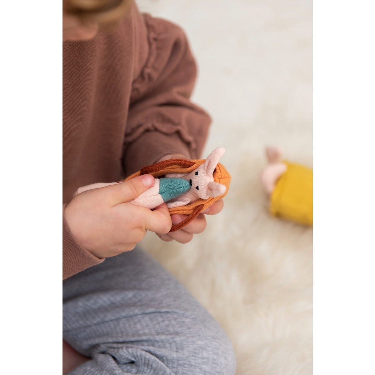 Say hi to Mrs. Rabbit and Baby Rabbit. These two cuties look forward to welcoming you in their home. Help Mrs. Rabbit take care of her little baby by giving bottles, singing lullabies and rocking it to sleep. Zip up and take this world of imagination anywhere you go.This fun range of animal puppets and their cute accessories spark children?s interest and creativity. Each little setting encourages them to tap in their own imagination and play creatively. Together with these little figurines, kids discover all the joys of open ended play! On top of that, children develop a great deal of valuable skills while playing with these puppets. By creating their own stories, children learn how to look at situations from different perspectives. Playing with these fun friends helps them expand their vocabulary and enhance their social skills.