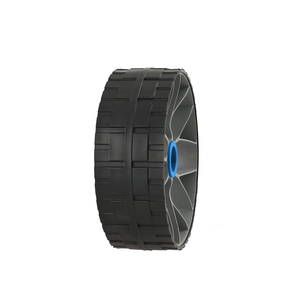 - Solid wheels with thermoplastic rubber 'tire' surfaces roll easily and are completely puncture proof