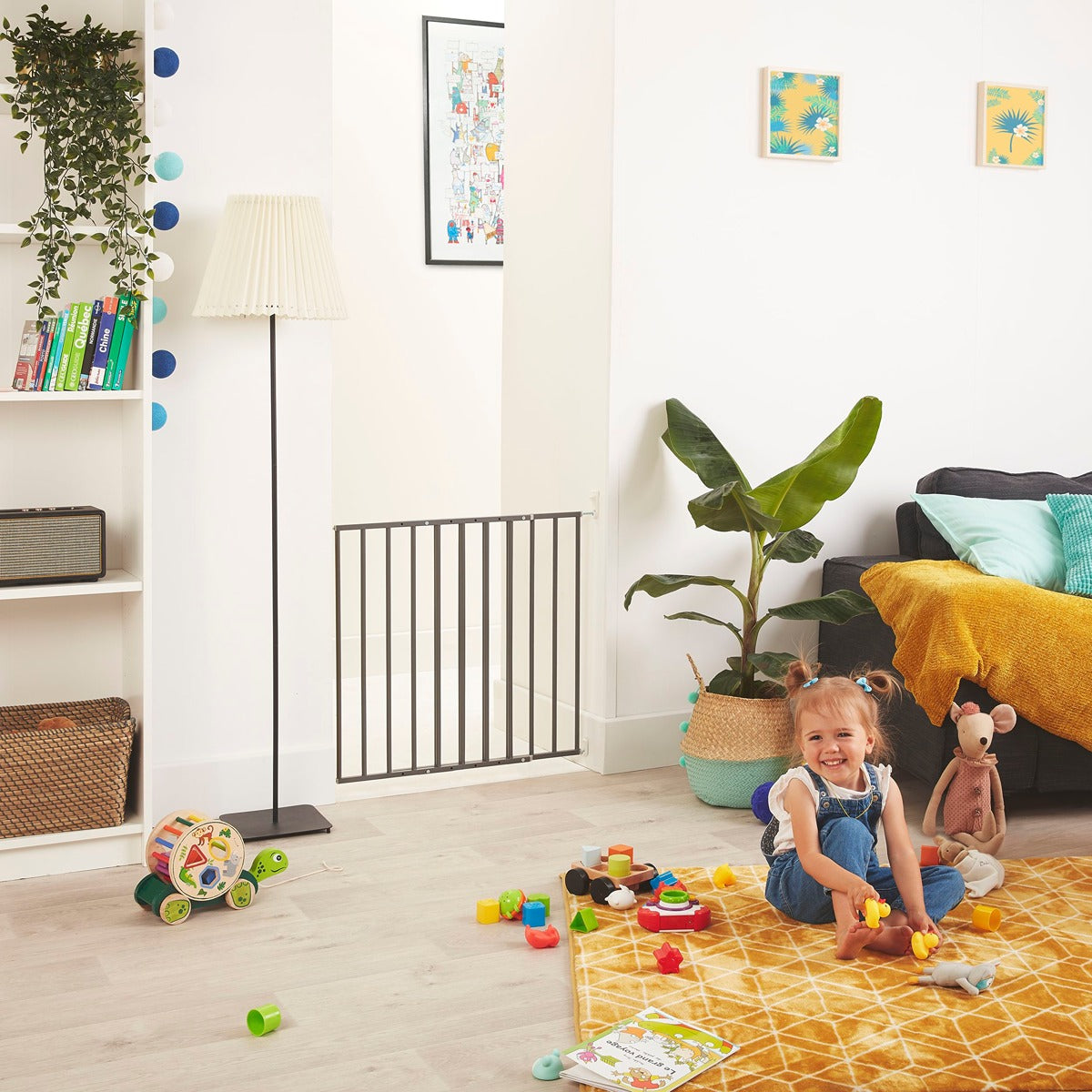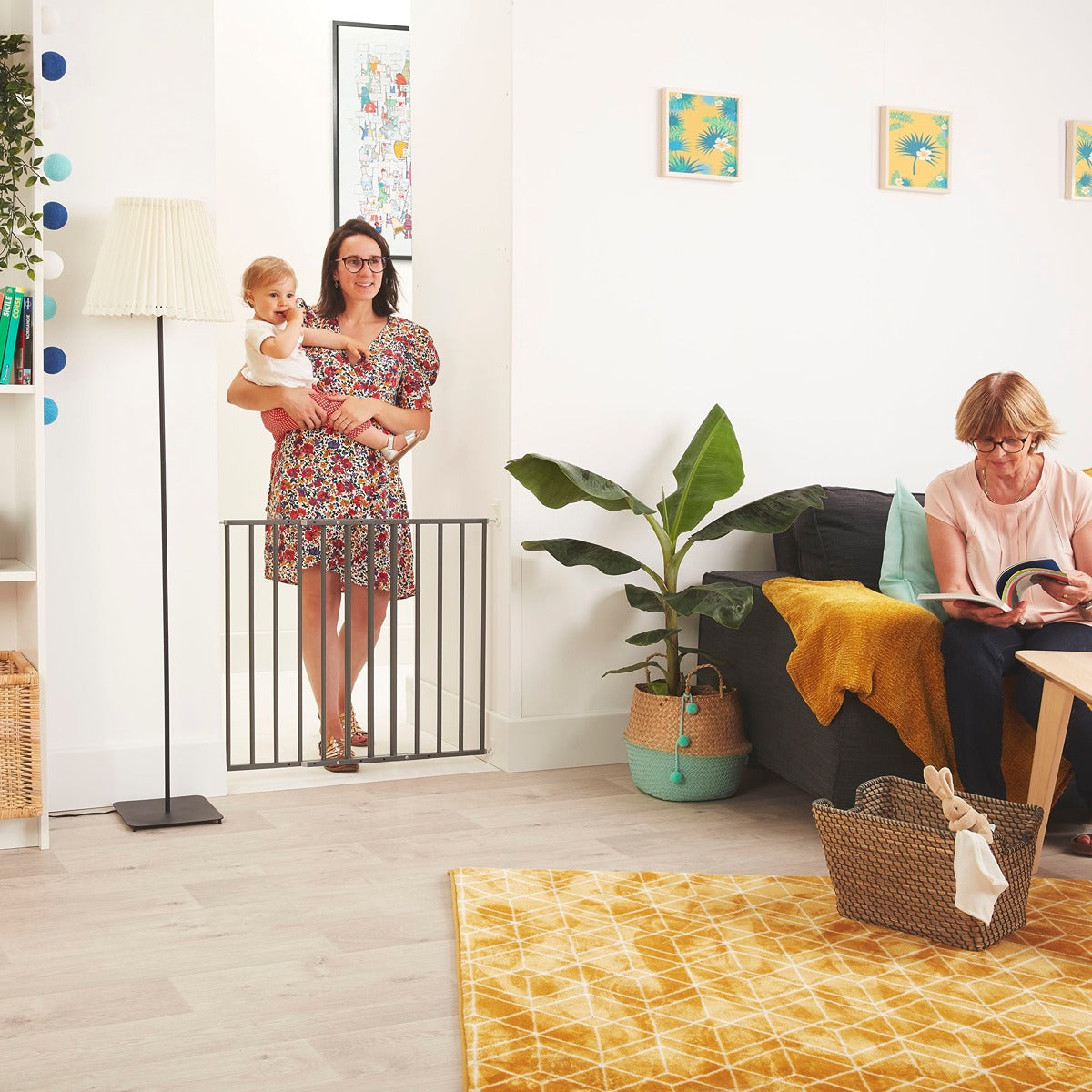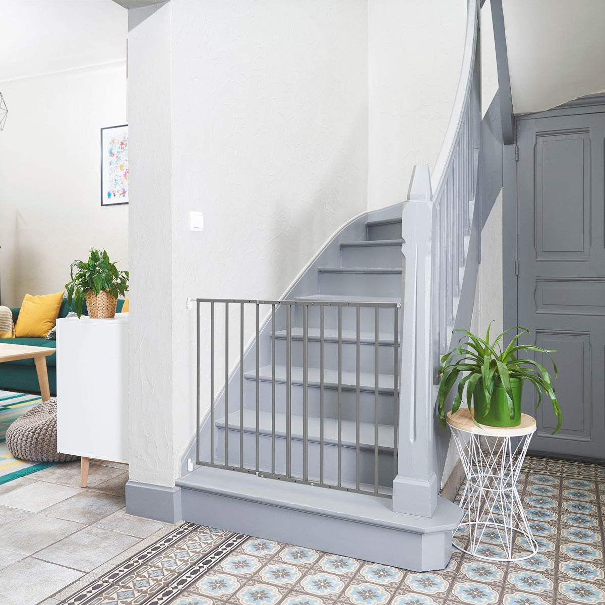 - Its easy screw-mounting system ensures real stability with easy installation. This universal gate is ideal for use within doorways, staircases, the kitchen, etc.