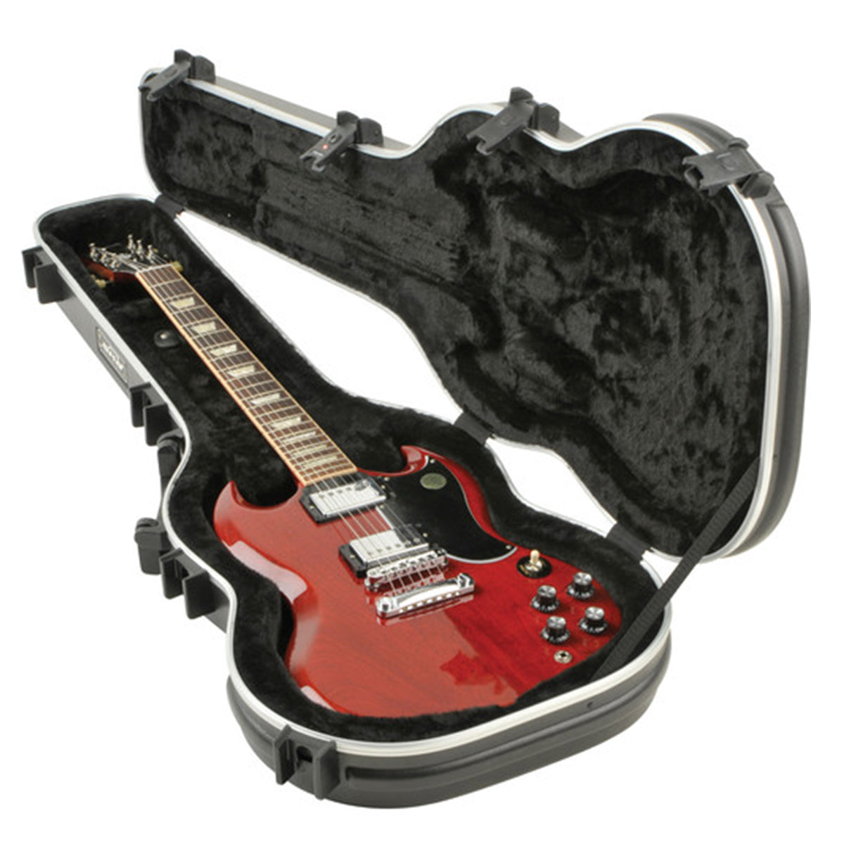 The SG Hard-Shell Guitar Case from SKB fits Gibson SG, Epiphone SG, and ESP LTV Viper series guitars, with the exception of the 12-string models. The case features full-length neck support and EPS interior foam to prevent the instrument from rattling during transport. The exterior of the case is made of polyethylene with molded-in bumpers for the valance protection system, and an overmolded handle. The nylon trigger release latches are reinforced with fiberglass and recognized and accepted by the TSA.