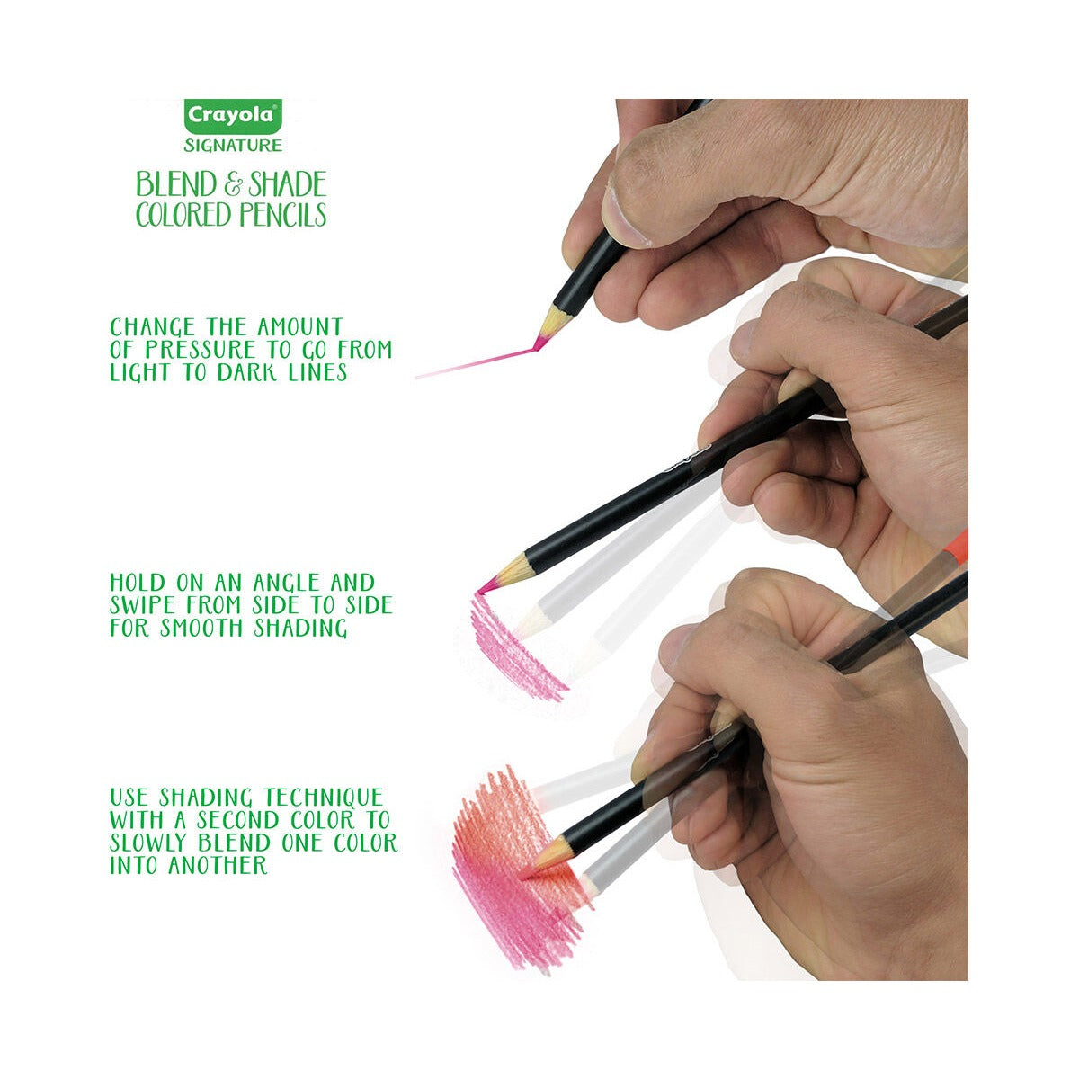Take your coloring, shading, and blending to a new level with Crayola Signature Blend & Shade Colored Pencils. These colored pencils feature soft, highly-pigmented cores for smooth color laydown. The stylish matte black barrels have color-dipped ends for a sophisticated look. Vibrant on light and dark paper, these premium art tools are a wonderful choice for artists aged nine years and older. Crayola Signature Blend & Shade Colored Pencils come in a stylish storage tin that?s perfect for gifting.