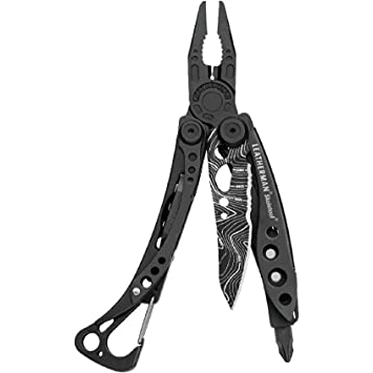 At a mere five ounces, the Leatherman Skeletool has a stainless steel combo blade, pliers, bit driver, removable pocket clip and carabiner/bottle opener. The Skeletool is just what you need in one good lookin" package. A topographical map design is laser-etched into the knife blade, and the handles have a matte black finish. Sheath sold separately.