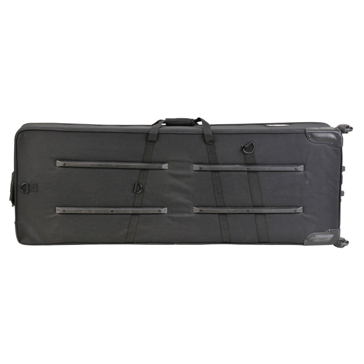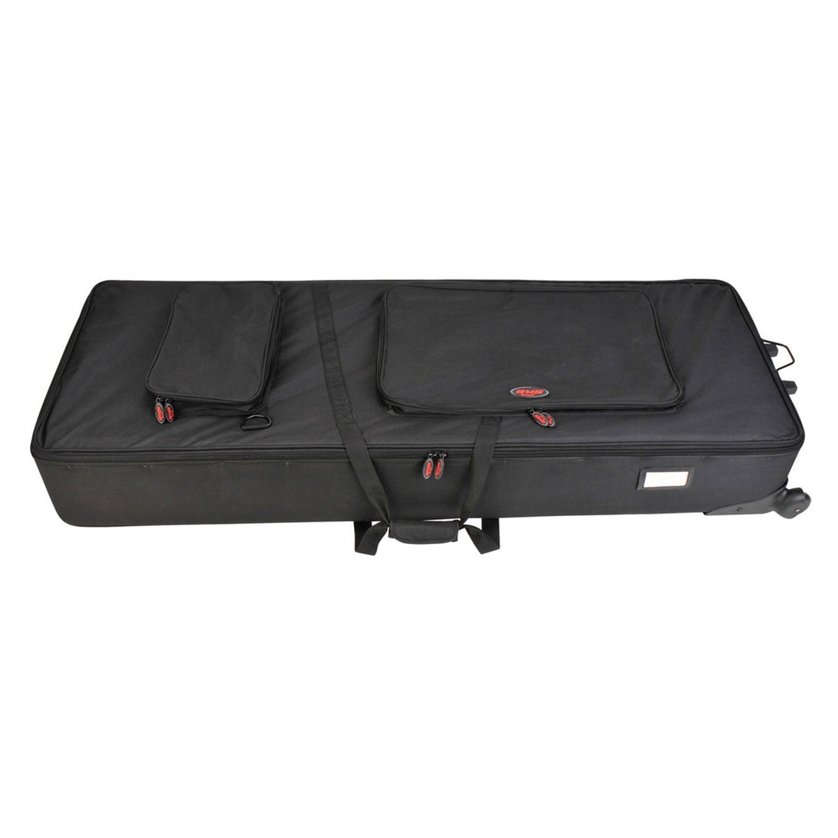 The SKB Soft Case for 88 Note Keyboards is an ideal solution when you need more than a gig bag but don"t require the protection of an ATA hard-shell case. A wood-framed wall surrounds the outer edges while the interior is fully lined and padded for extra protection. The exterior is made of 600-denier nylon and uses hefty double-pull zippers. Two large padded straps provide additional protection and security. The Soft Case rolls on a pair of in-line skate wheels allowing for smoother and less strenuous transportation. When you need to pick it up, use the handles or carry it on your back with the rear shoulder strap. It also has a built-in expanding stabilizer that stands the case on end when you need a rest. This case has plenty of storage capacity with two large external pouches for cables, pedals, and other accessories. You can tack on an additional bag using the included piggyback strap. If you like to keep your things nice, that shouldn"t be a problem with the stair rails located on the back of the case. The sides include an additional pair of trunk rails to protect it when loading and unloading and should keep your bag looking its best for a long time to come.