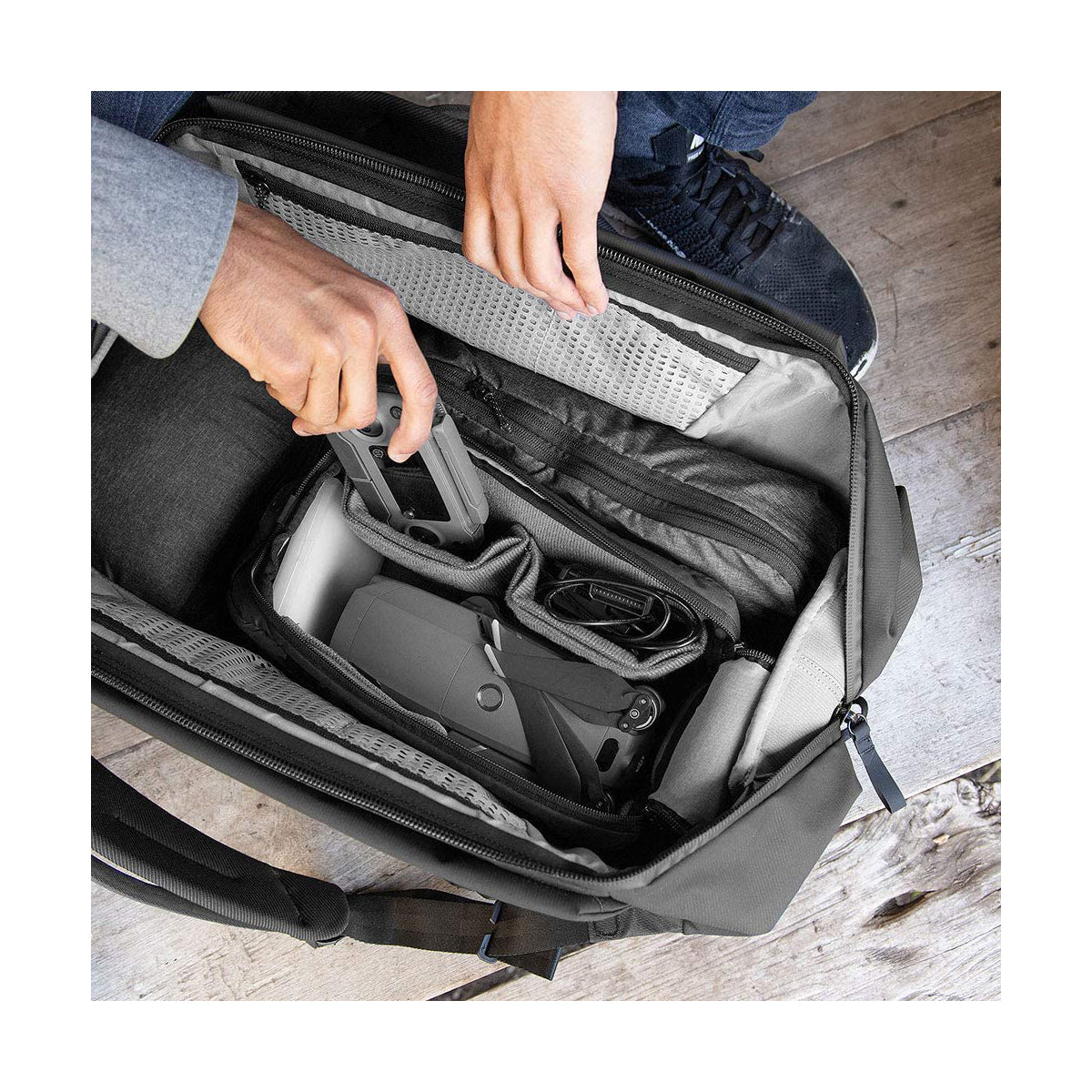 The Travel Duffelpack 65L in black from Peak Design is a duffel-style bag with an ID card holder that has a top made from 100% recycled 600D nylon canvas and a 900D ottoman-weave polyester fabric bottom. The long oversized #10 weatherproof zipper allows the bag to be opened wide, so you have ample room and easy access to equipment. The bag is designed to hold four optional packing cubes and there are two internal and external pockets for accessories. Built-in theft-deterrent main and side zipper-pull locks keep your gear safe. Six padded hand straps allow you to virtually carry the bag from any side. The bag also has backpack-style straps with an adjustable sternum strap, and a waist belt, so you can carry the oversized bag in comfort.