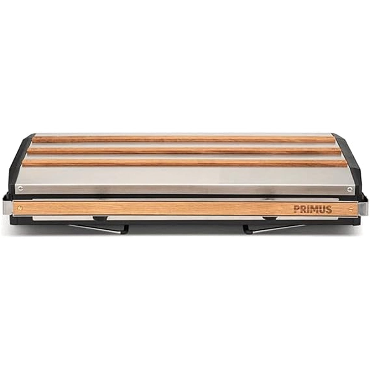 Deliver a kitchen-like cooking experience at any basecamp with this elegant wood-trimmed 2 burner stove. This elegant Swedish design-inspired, 2 burner stove is the choice of aspiring chefs who enjoy practicing their trade in the great outdoors. This gas stove has the capacity to cook five-star meals, but is light and compact to easily take anywhere. The foldable legs provide valuable additional table space and can lock into place while cooking, or opt for the lower ultra-stable option. Easily fire up either burner with the push button Piezo igniter. Each burner runs independently, allowing outdoor chefs to cook multiple pots at a wide range of temperatures, keeping the sauce slowly simmering and the water at a rolling boil from the 10,200 BTU (3000W) flame. In windy conditions, the lid and side windscreens lock into place to ensure steady cooking. The sleek stainless steel body, die-cast aluminum sides, oak laths and brass details upgrade the look of any campsite, and will hold up to many years of use. The internal pot supports and drip tray are removable for easy cleaning. When storing, simply lock closed ? this slim-profile stove can be stashed almost anywhere. Comes with a non-stick griddle plate that grills, toasts, melts cheese, then can easily be cleaned.