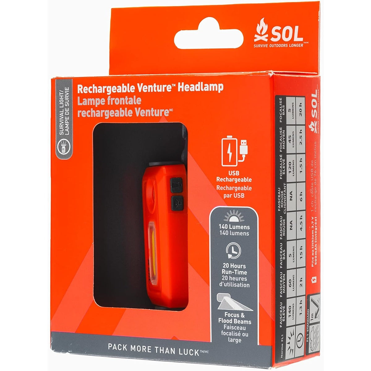 The Rechargeable Venture Headlamp features 20 hours of run time and 8 lighting modes including focus, flood, red, and flashing ranging from 140 ? 5 lumens. Create a lantern with four magnets on the back of the headlamp that can attach to a magnetic surface. Hang, wear, or pack the SOL Rechargeable Venture Headlamp to extend the adventure into the night.