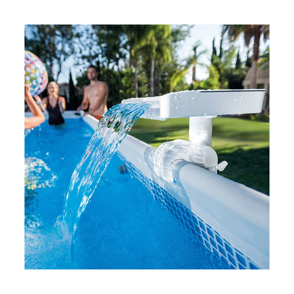 Add a touch of tranquillity to your Intex elevated pool with this multi-coloured LED waterfall. The soft and pleasant waterfall improves the bathing experience by producing refreshing negative ions on the surface of the water, bringing serenity and relaxation while enjoying your pool. Made of white PVC material, the waterfall measures 33 x 28 x 29 cm. Easy installation and operation. The waterfall incorporates a stand to attach it to the edge of the detachable pool. Connect the waterfall to the purifier outlet tube so that with the force of clean water coming back to the pool, the LED lights are activated. The flow range required by the hydroelectric generator that incorporates the waterfall is between 3596 and 2974 litres/h (950-2450 g/h). The diameter of the tube must be 38mm in diameter. This accessory fits round and rectangular pool models of the Intex Metal Frame, Prisma Frame and Ultra Frame line (not suitable for easy set, oval or graphite panel models). The Intex multi-coloured waterfall LED lights are changing in red, blue and green. Waterfall includes a kit with hydraulic bypass valve to regulate water pressure. Discover a world of solutions with Intex to enjoy your detachable pool this summer