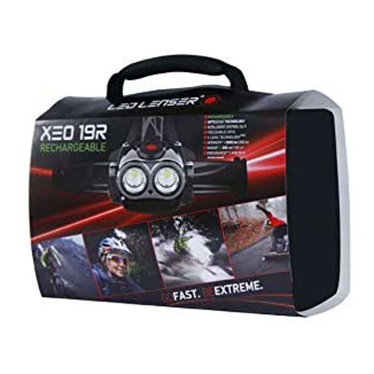 LED Lenser XEO 19R Rechargeable Extremely bright. Extremely active. Extremely well-tailored to your needs. This headlamp is fitted with two independently adjustable Led light cannons that live up to every challenge thrown at them. Offering up to an unbelievable 2000 Lumen of lighting power in Boost mode. The Leds can also be individually focused. The light is optimally distributed at all times and tailored to your needs. And the operation Controlling high-end technology has never been easier. The two lenses, each featuring LED Lensers world renowned patented Advanced Focus SystemTM optics and the very latest CREE LEDs, are housed in a water resistant (IPX6) protective casing and throw out incredible cannon beams of light which can be easily directed where required. The 5-way switch is fitted with three power levels, an adjustable dimmer and emergency light. And the XeO isn"t just a headlamp, it can also be handheld. Each lens can be activated independently or, using the incorporated X-Lens TechnologyTM, they combine together to form one single unblemished beam of light. Each lens can also be focused instantly for spot beam, flood beam or a combination of the two offering exceptional flexibility. This unit comes with a number of different mounts including a rail mount ideal for tripods or bike handle bars, also a helmet mount for all you bike riders .