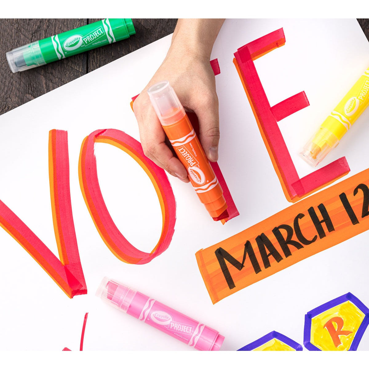 From the Crayola Project line, these supersized markers are perfect for a variety of full-coverage art projects and crafts. Create super thick lines with these bold, extra-wide chisel tips. School projects, presentations, posters, signs and decorations stand out with crisp, wide lines in bright colors. Set includes 4 XL Poster Markers in bright colors: Violet, Magenta, Yellow, and Orange. Ideal for adults and kids, ages 6 and up.
